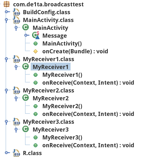 1 2 3 4 5 6 7 8 9 10 11 12 13 14 15 16 17 18 19 20 21 <receiver android:enabled ="true" android:exported ="false" android:name ="com.de1ta.broadcasttest.MyReceiver3" > <intent-filter > <action android:name ="com.de1ta.receiver3" /> </intent-filter > </receiver > <receiver android:enabled ="true" android:exported ="false" android:name ="com.de1ta.broadcasttest.MyReceiver2" > <intent-filter > <action android:name ="com.de1ta.receiver2" /> </intent-filter > </receiver > <receiver android:enabled ="true" android:exported ="true" android:name ="com.de1ta.broadcasttest.MyReceiver1" > <intent-filter > <action android:name ="com.de1ta.receiver1" /> </intent-filter > </receiver > <activity android:name ="com.de1ta.broadcasttest.MainActivity" > <intent-filter > <action android:name ="android.intent.action.MAIN" /> <category android:name ="android.intent.category.LAUNCHER" /> </intent-filter > </activity >
