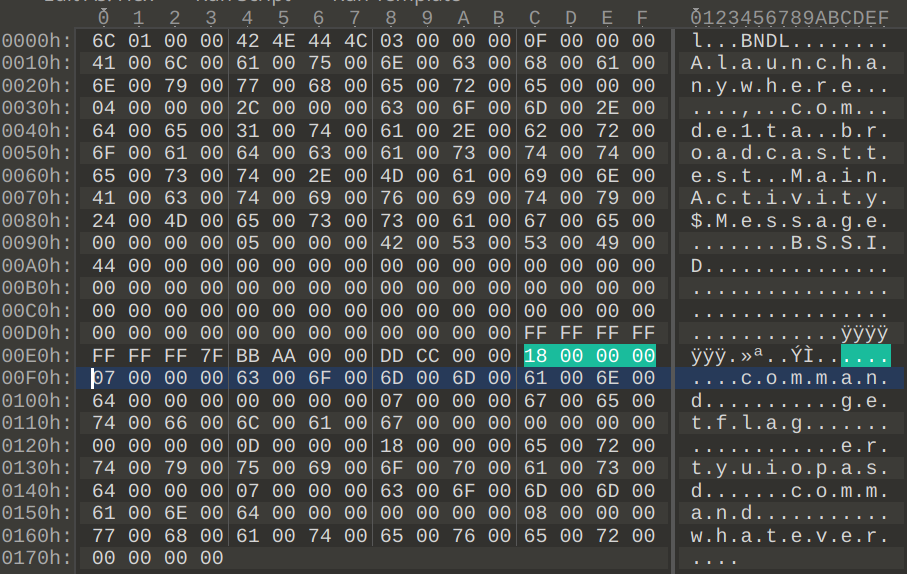 1 2 0700 0000 c.o. m.m. a.n. d... 0000 0000 0700 0000 g.e. t.f. l.a. g... |Key Len |Key |Val Type |String L |String Content